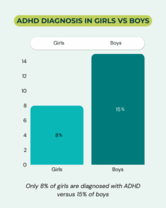 There has long been a distinct gap in the diagnosis of ADHD in boys versus girls. Boys (15%) are nearly twice as likely to be diagnosed with ADHD as girls (8%), though that gap shrinks as they move to adulthood. It has previously been thought that boys are more likely to have ADHD, but there is growing evidence that girls are simply diagnosed at a lower rate—a discrepancy which fades as women pursue diagnoses on their own later in adulthood.